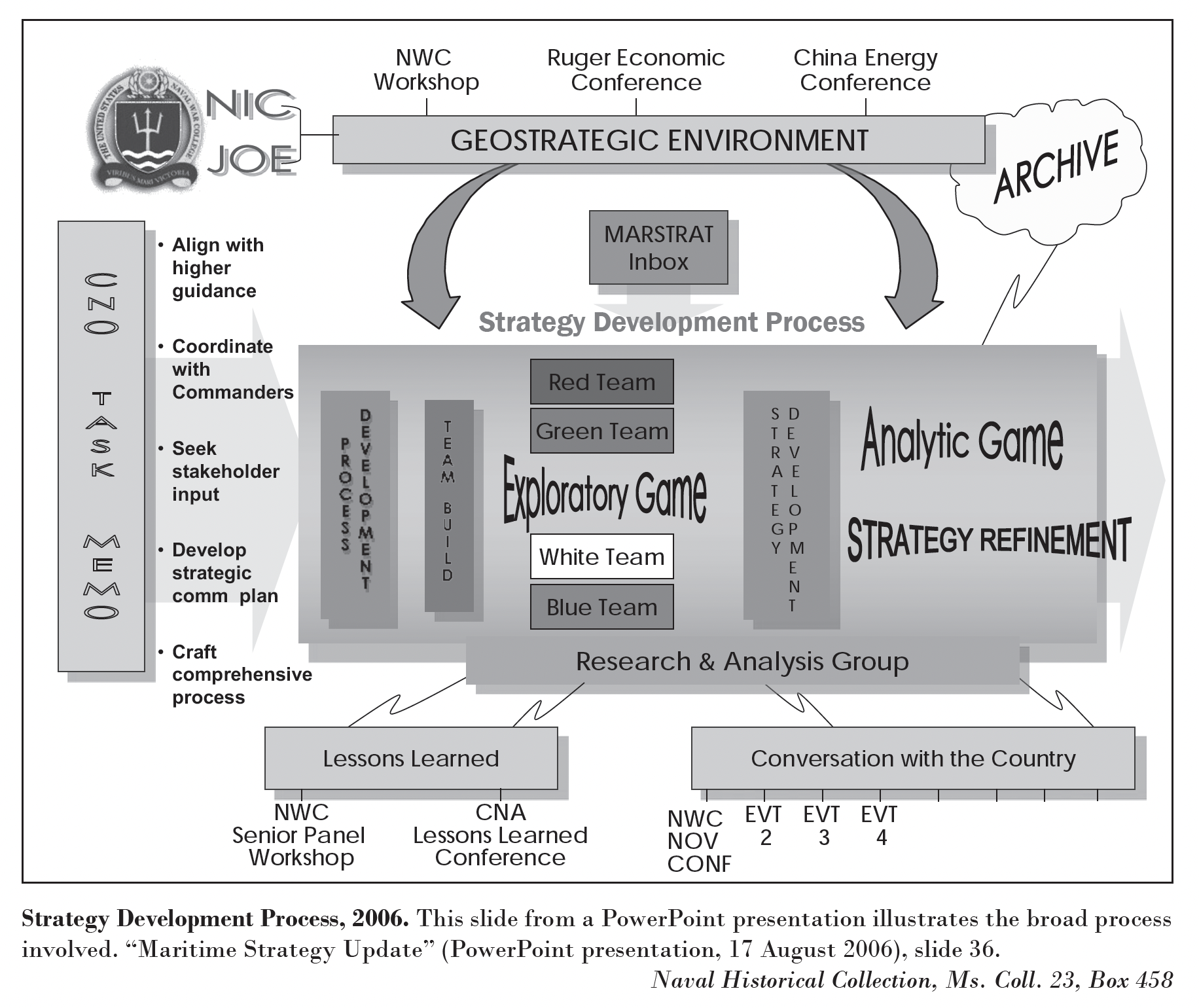 Strategy Development Process, 2006. This slide from a PowerPoint presentation illustrates the broad process involved. “Maritime Strategy Update” (PowerPoint presentation, 17 August 2006), slide 36. Naval Historical Collection, Ms. Coll. 23, Box 458 [NOTE “CHINA ENERGY CONFERENCE,” CMSI’S SECOND CONFERENCE]