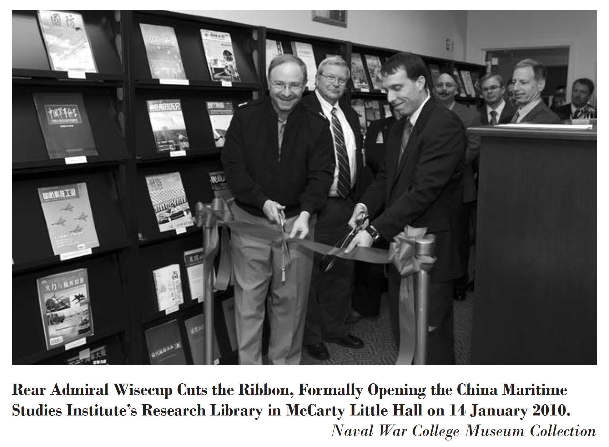 Rear Admiral Wisecup Cuts the Ribbon, Formally Opening the China Maritime Studies Institute’s Research Library in McCarty Little Hall on 14 January 2010.