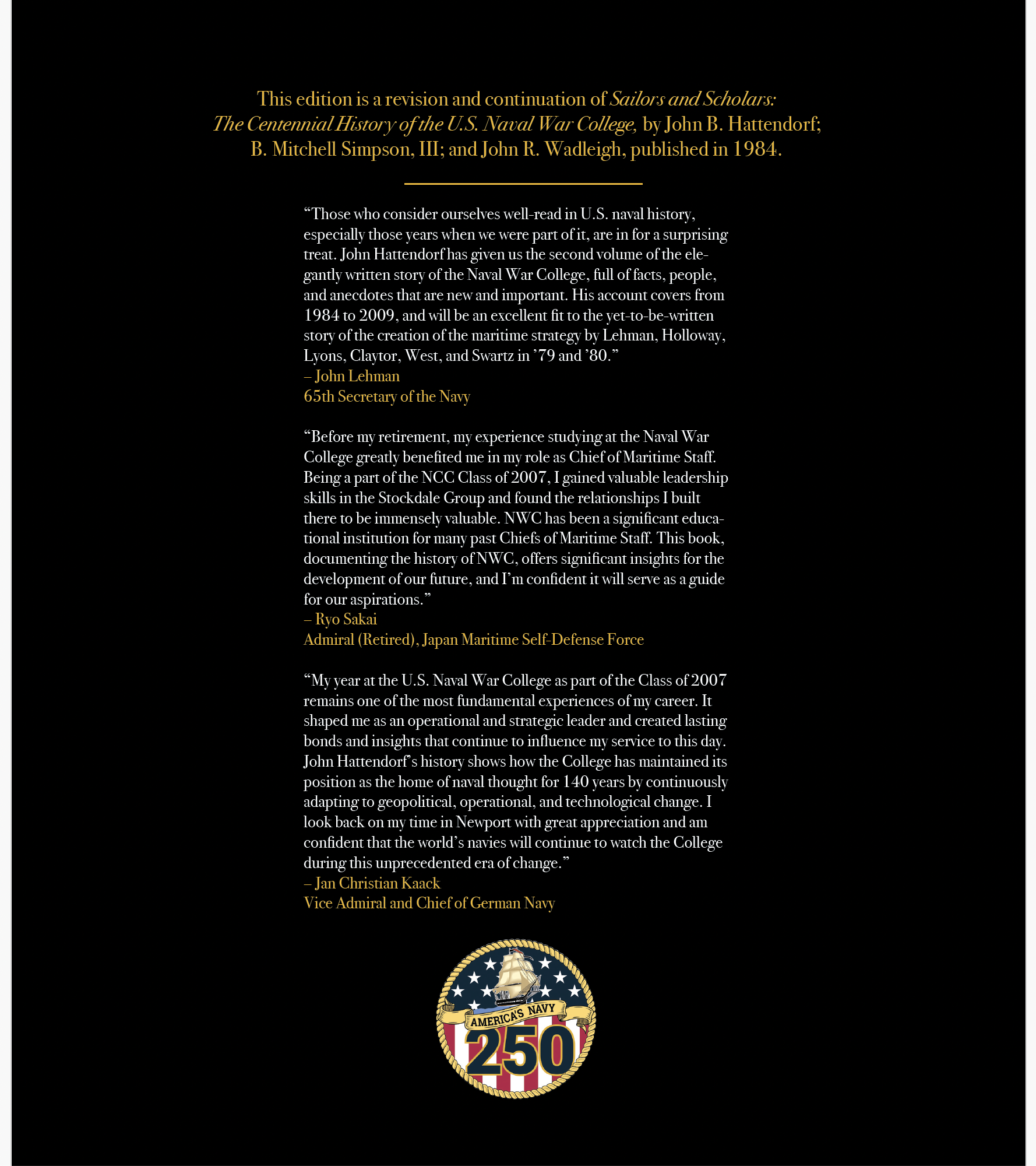 John B. Hattendorf, Sailors and Scholars: The History of the U.S. Naval War College, 1884–2009, Second Edition, Vol. 2 (Newport, RI: Naval War College Press, 2025), 546–49, 553–54; 412–13, 418, 468, 530, 640, 649, 695–96, 729.
