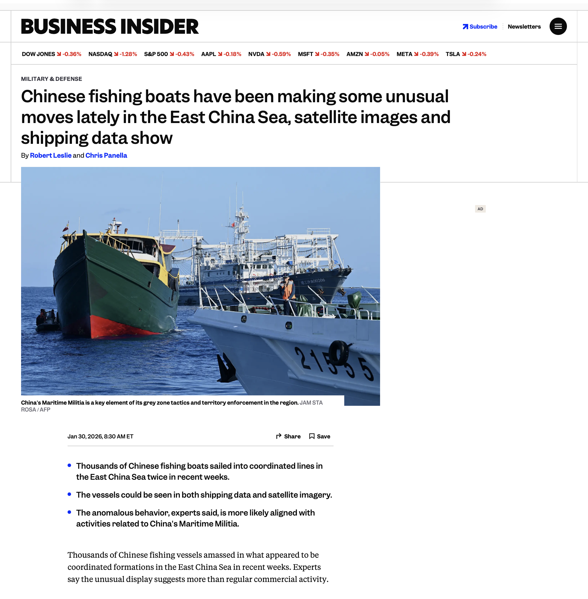 Robert Leslie and Chris Panella, “Chinese Fishing Boats Have Been Making Some Unusual Moves Lately in the East China Sea, Satellite Images and Shipping Data Show,” Business Insider, 30 January 2026.